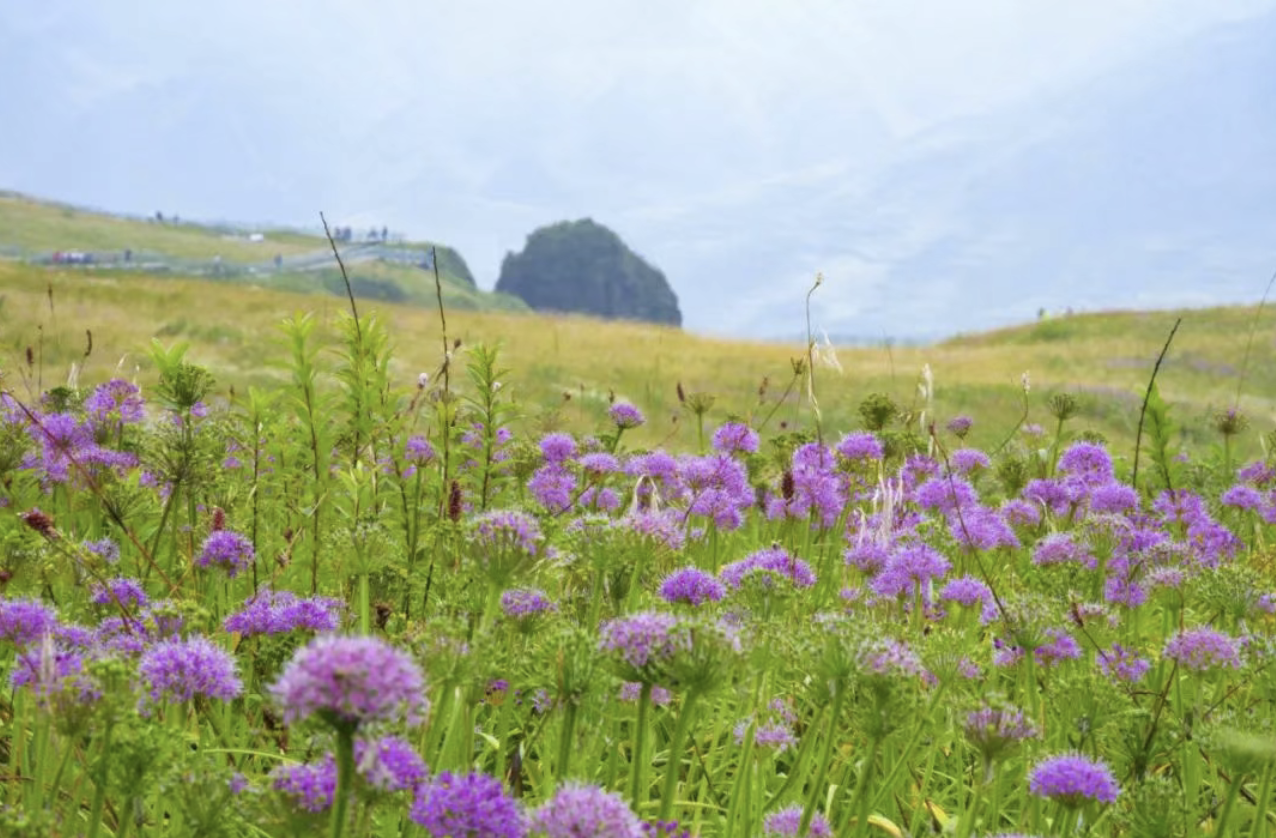 韭菜坪,是世界上最大的野韭菜花带,海拔很高,也是贵州的第二高峰,素有“贵州屋脊”的美誉。每年的8-9月,是韭菜坪风光最美的时节,漫山遍野的韭菜花,被连绵的紫色花海包围,如人间仙境般美好。在山顶,看风起云涌,放松身心。